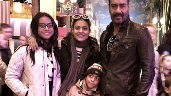 Bersama kedua anaknya dan sang suami, Ajay Devgan.