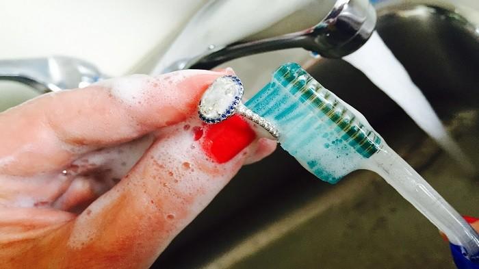 Taruh sedikit pasta gigi di sikat gigi bekas dan gunakan untuk membuat cincin berlian kembali berkilau.
