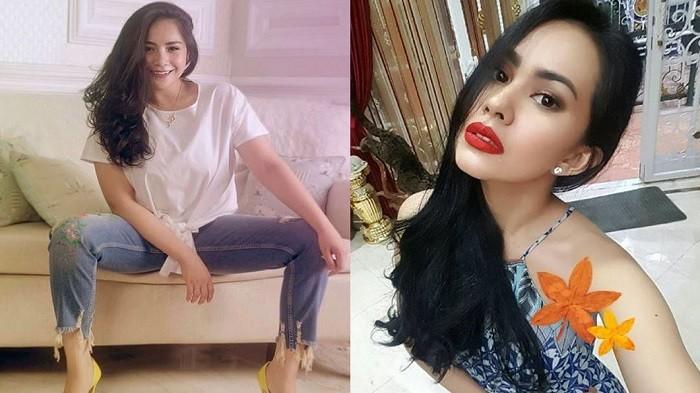 Nagita Slavina dan Kartika Putri sama-sama mengenakan pakaian atasan berwarna putih. Sedangkan celana mereka berwarna cokelat muda.