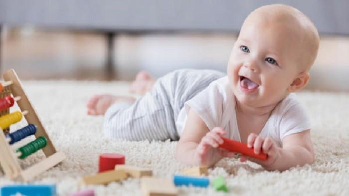 Posisikan bayi tengkurap, lalu letakan mainan berwarna menarik di hadapannya, usahakan mainan itu berada dalam jangkauan bayi.