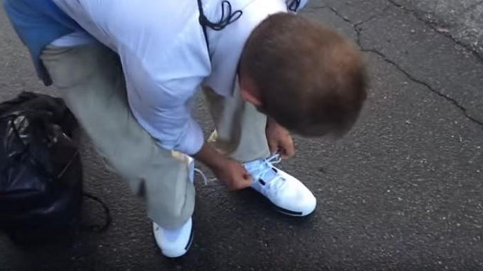 Mendengar cerita dari tunawisma ini, akhirnya pria ini memutuskan untuk memberi sepatu adidas yang sedang dia pakai.