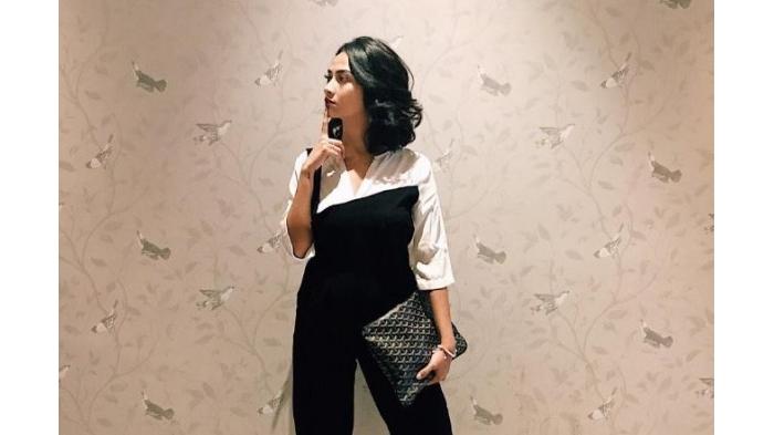 Vanessa Angel terlihat menenteng sebuah clutch berwarna monokrome.