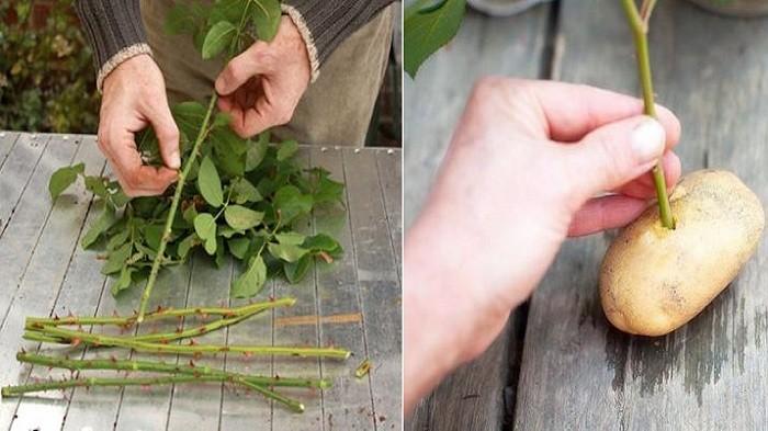 Kemudian masukkan batang mawar yang tadi sudah dirapikan ke dalam lubang kentang tersebut.