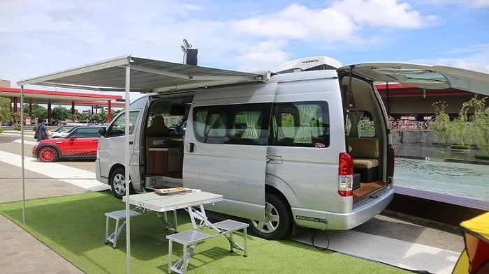Hiace keluaran 2018 ini dimodifikasi bagian interiornya dengan konsep Motorhome.