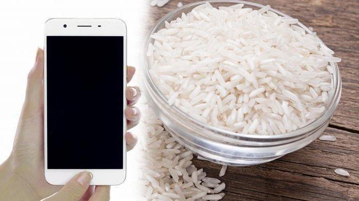 Lalu masukkan hape kamu ke dalam beras yang tadi sampai seluruh bodinya tertimbun.