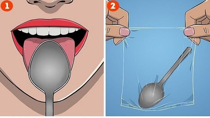 1. Ambil sebuah sendok, usapkan ke seluruh permukaan lidah sehingga basah dengan air liur kamu.