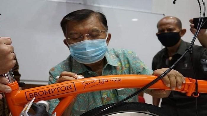 "Bukan sembarang sepeda, sepeda Brompton pabrikan London Inggris ini telah dibubuhi tanda tangan Ketua Umum PMI, Jusuf Kalla dan Sandiaga Uno," demikian keterangan foto tersebut.