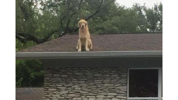 Ada anjing berada di atap rumah.