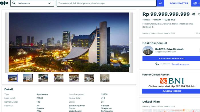 Pemasang iklan yang tidak disebutkan identitasnya menawarkan Hotel Gran Meliá Jakarta dengan nilai Rp 2,3 triliun.
