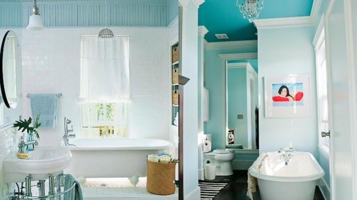 Namun, warna biru bisa juga digunakan untuk cat dinding dan plafon kamar mandi loh.