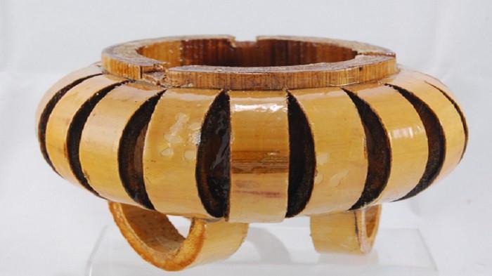 Limbah bonggol bambu itu disulap menjadi sebuah kerajinan asbak dan tempat pensil yang unik.