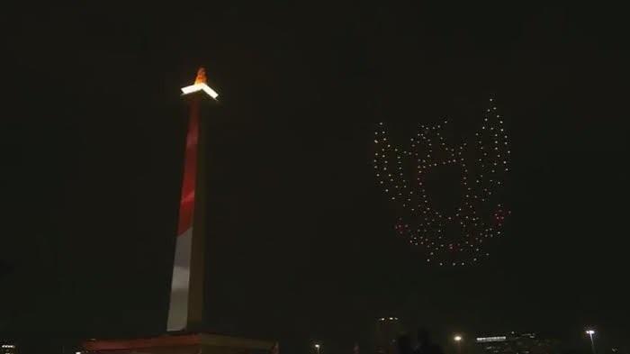 Tak hanya itu, ribuan drone juga berhasil membentuk lambang negara, Garuda terpampang gagah di langit Monas.