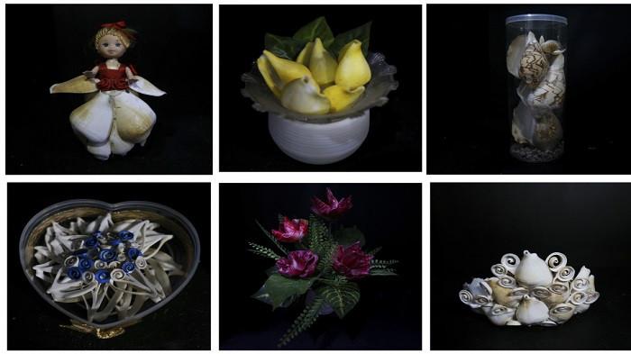 Hasil produk kerajinan cangkang gonggong yaitu bunga, boneka, mahkota, hiasan dinding, dan berbagai cinderamata lain.