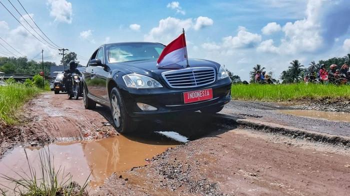 Bahkan, mobil itu harus berbelok ke kiri dan kanan demi menghindari lubang-lubang yang 'tersebar' di permukaan jalan.