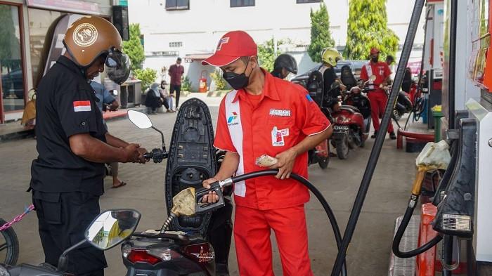 Setelah bensin terisi, pengemudi motor masih menggoyang-goyangkan motornya.
