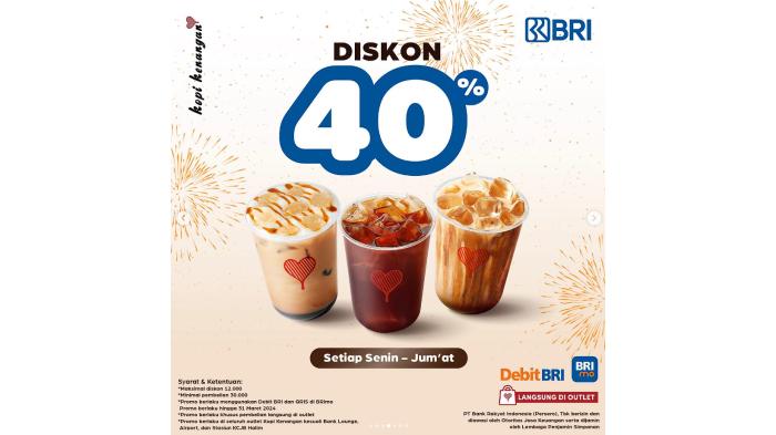 Kopi Kenangan menawarkan promo diskon terbatas setiap hari Senin-Jumat hingga 31 Maret 2024 untuk pembayaran menggunakan BRI.