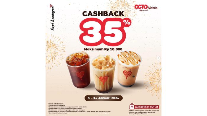 Kopi Kenangan menawarkan cashback 35% setiap pemesanan menggunakan pembayaran Octo Mobile by CIMB Niaga.
