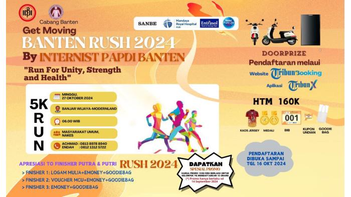 BLOG.TRIBUNJUALBELI.COM - Perhimpunan Dokter Spesialis Penyakit Dalam Indonesia atau PAPDI Cabang Banten bekerjasama dengan Tribun Booking sebagai platform ticketing mengundang seluruh masyarakat dan tenaga medis di Banten serta sekitarnya untuk berpartisipasi dalam Banten Rush 2024.