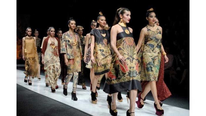 Ivan berdiri di depan para model yang memakai baju batik rancangannya.
