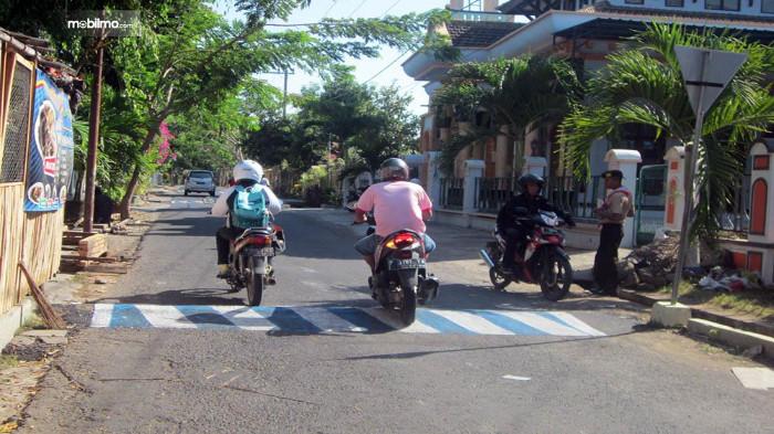 Saat melewati polisi tidur disarankan motor dalam keadaan lurus, hindari menyamping saat melewatinya.