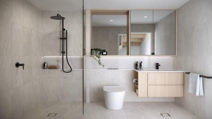 Desain minimalis tidak hanya memudahkan dalam hal penataan ruang, tetapi juga membuat kamar mandi terlihat bersih dan modern.