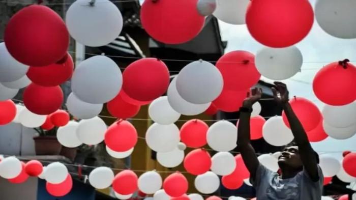 Gunakan balon warna merah dan putih, kemudian rangkai membentuk lengkungan atau menara di pintu masuk.