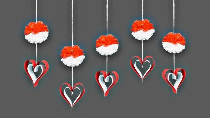 Gunakan kertas lipat, karton, atau pita berwarna merah putih untuk membuat rangkaian bendera segitiga mini, bintang atau bunga hias, hiasan dinding berbentuk angka 17 atau siluet pulau Indonesia