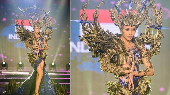 Finalis asal Indonesia tersebut mengenakan kostum bertema Ibu Pertiwi: Langit adalah Ayahku, Bumi adalah Ibuku.