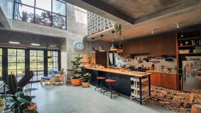Untuk menyeimbangkan kesan keras dari material industrial, banyak hunian menambahkan tanaman hias sebagai elemen penyegar.