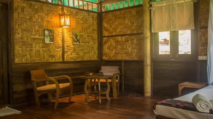 Dinding anyaman bambu juga dapat menjadi elemen dekoratif tanpa perlu tambahan ornamen berlebihan.