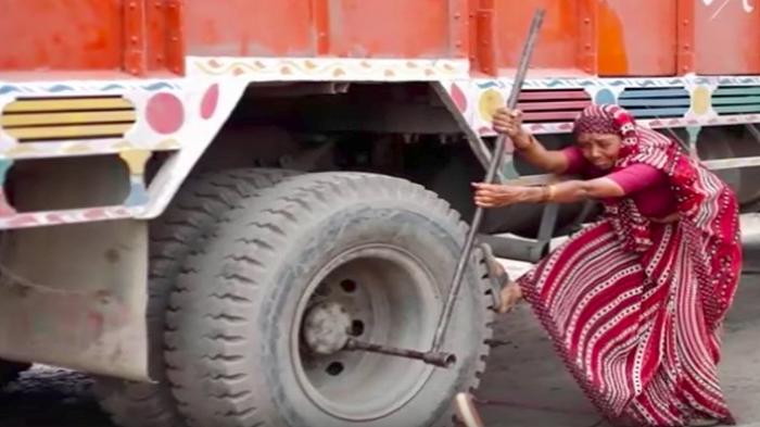 Setiap orang yang datang ke bengkel terkejut melihat keahlian Shanti Devi membetulkan ban truk seperti mekanik ahli.